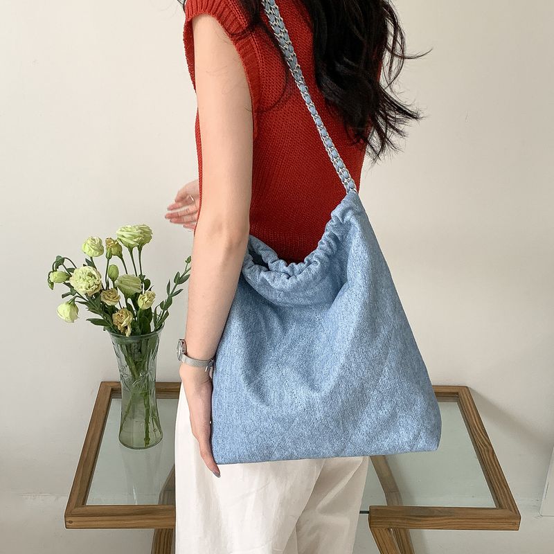 Sac fourre-tout matelassé à chaîne de style coréen pour femmes, grande capacité, nouveau sac à bandoulière décontracté en denim délavé pour les déplacements quotidiens, 2025