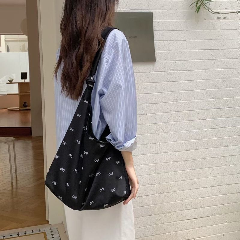 Niche design bow canvas bag, single shoulder tote bag, foldable shopping bag, 2024 new fashion and artistic style