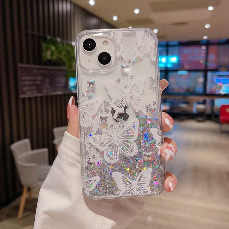 Convient pour iPhone 15 ProMax téléphone Apple 14 papillon paillettes rose patch diamant sables mouvants, étui de protection 12/13