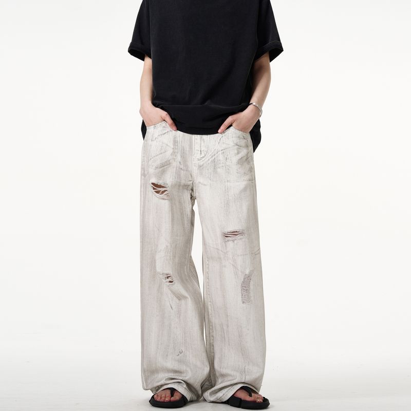 Summer washed vintage ripped jeans for men and women, loose straight leg, hanging feeling, wide leg, floor length pants, trendy men's clothing