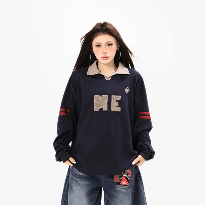 Sweat-shirt à col rabattu avec lettres brodées, style américain, unisexe, nouveau polo ample et décontracté en jersey 2025