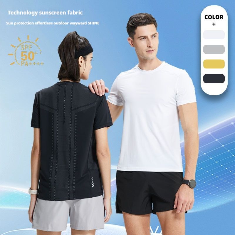 Casual printed sun protection sports fitness top, round neck short sleeved T-shirt, men's outdoor ice silk moisture absorbing running speed dryer