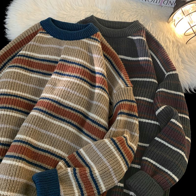 Thick Line Crew Neck Sweater for Men, Autumn and Winter New Style, Color-Block Striped Design, Casual Loose Pullover Base Knitwear