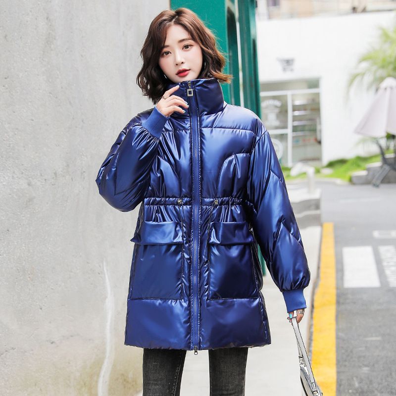 Korean version of medium to long length bright face no wash down cotton jacket, women's loose cotton jacket, fashionable winter warm waist jacket, trendy