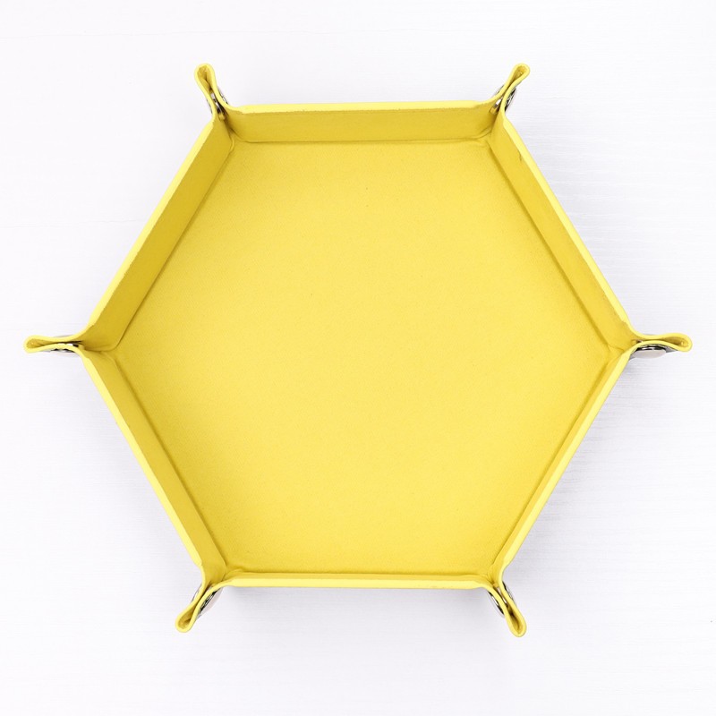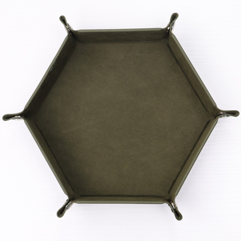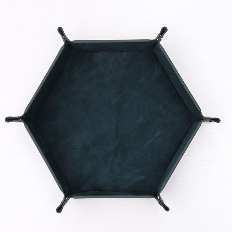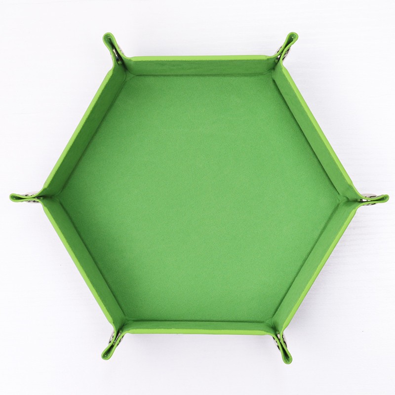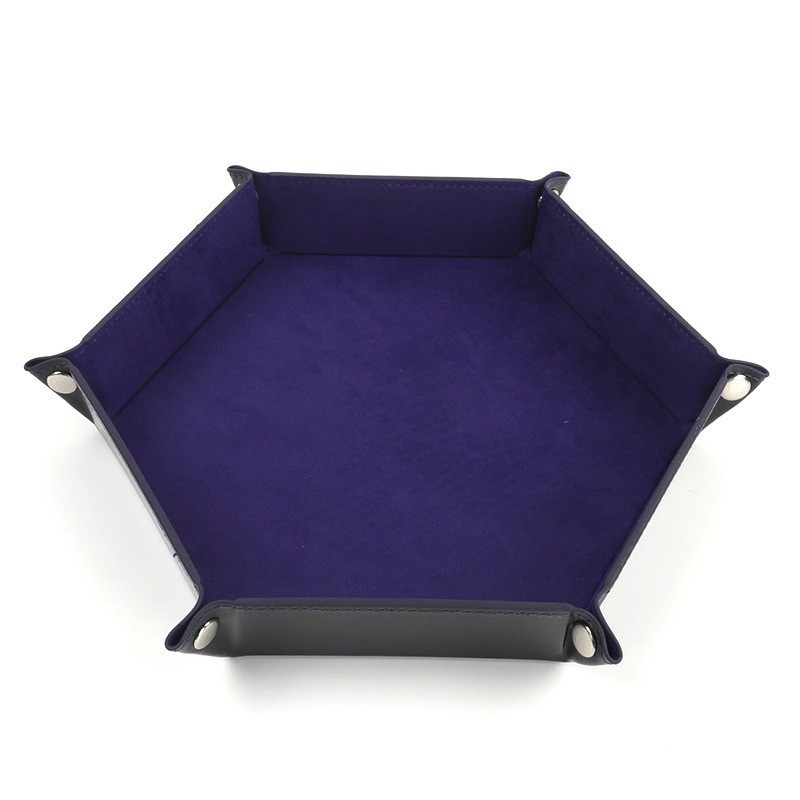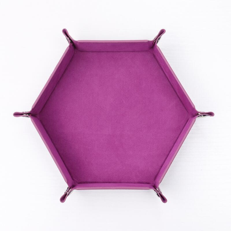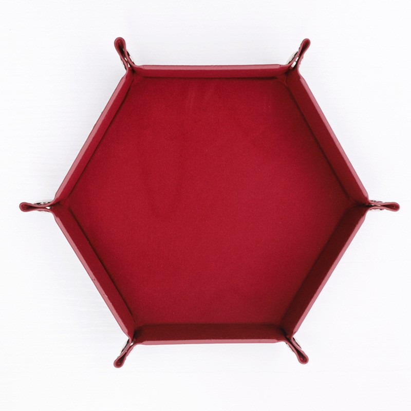 Boîte de rangement hexagonale en velours pour petits dés, en cuir PU, avec plateau pliable.