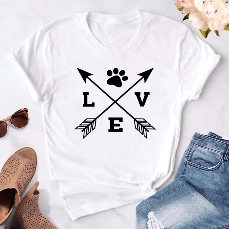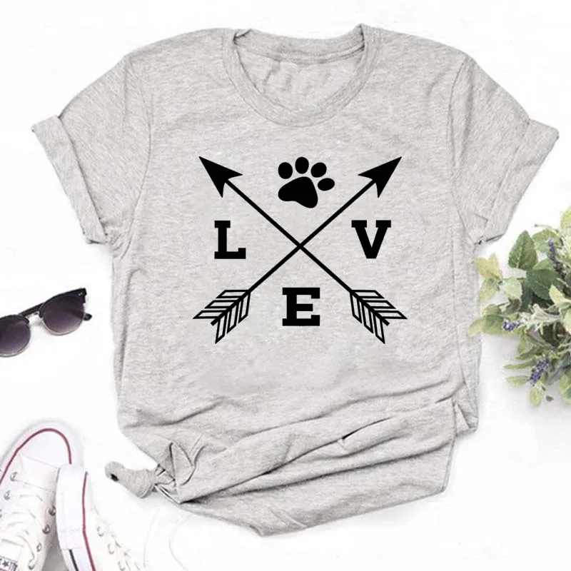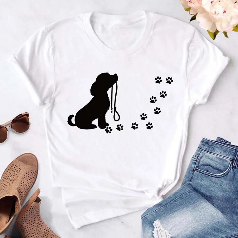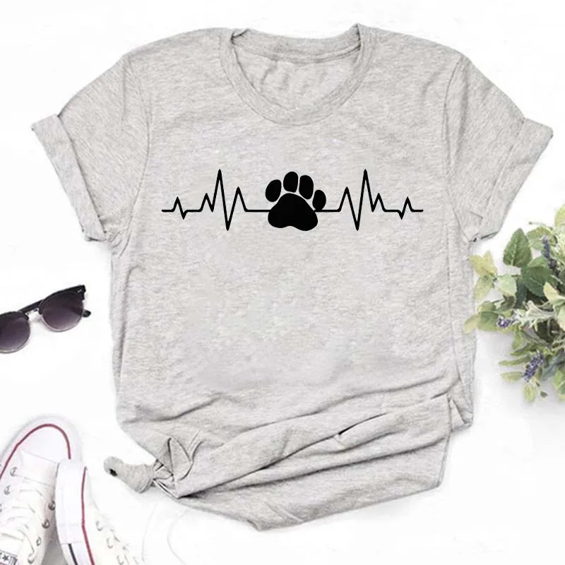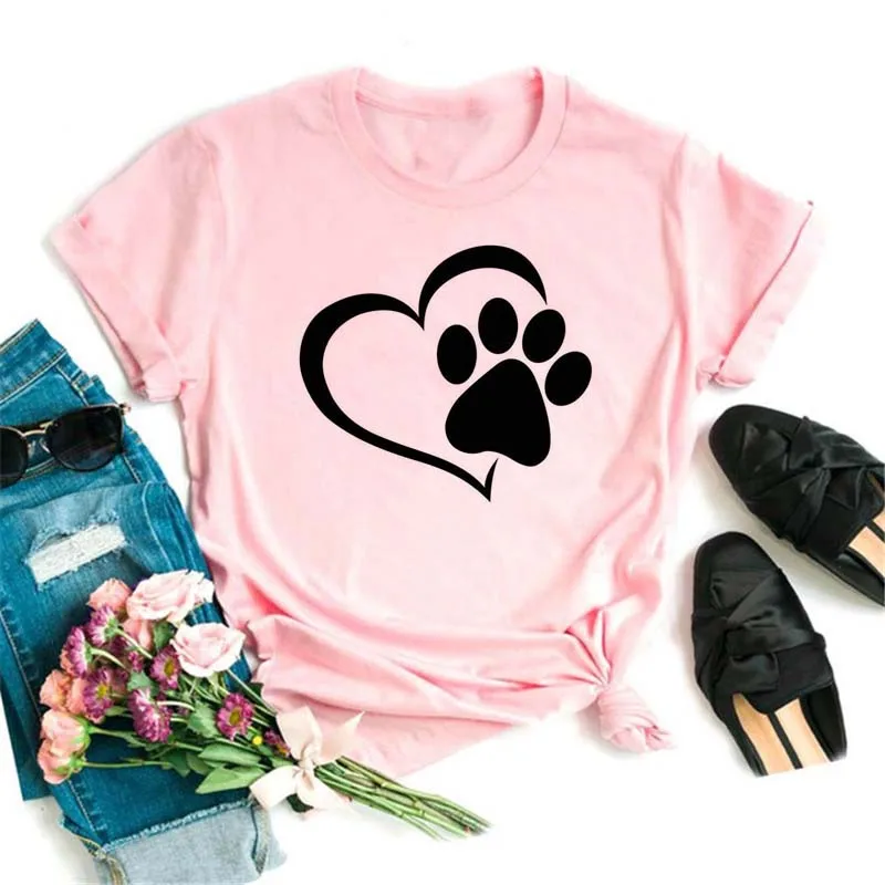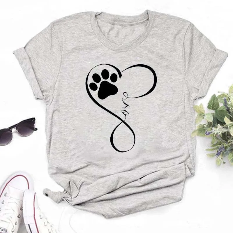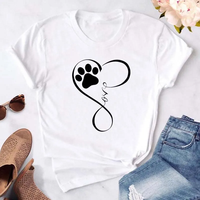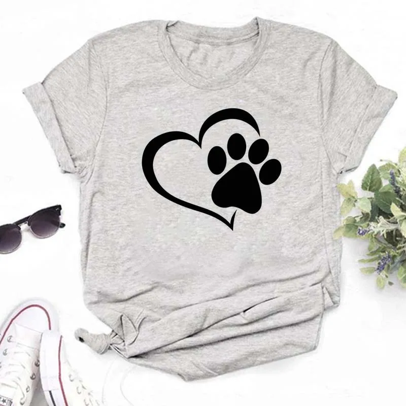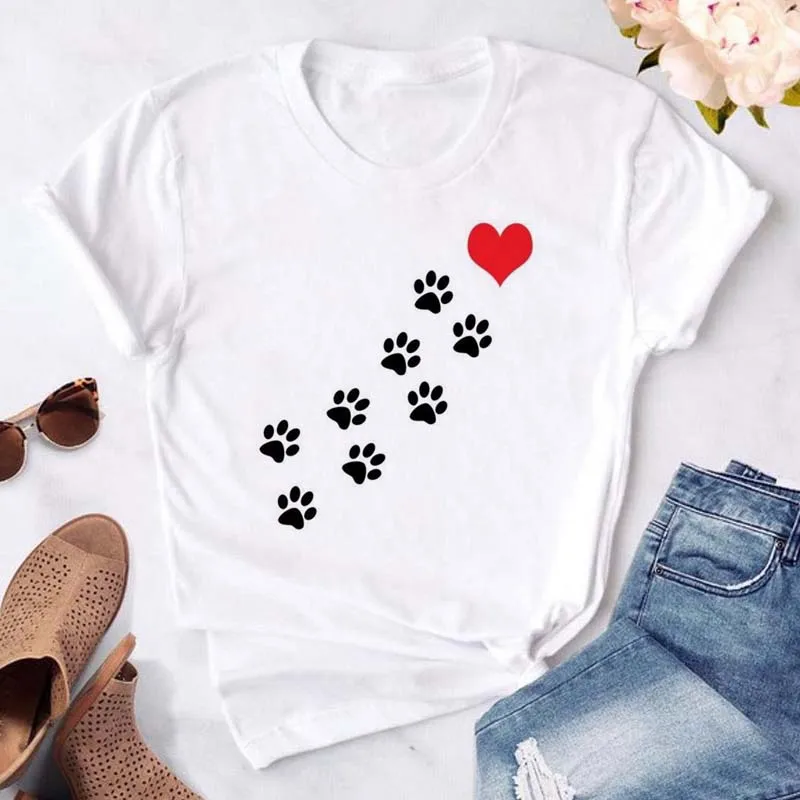 T-shirt imprimé pattes de chien et cœur pour femme, vêtement d'été à manches courtes, noir, 993