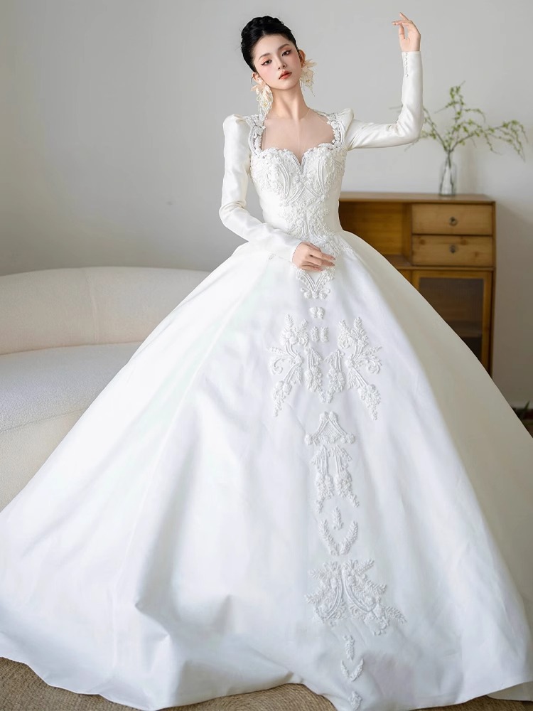 Vêtements pour femmes nouveau style mariée petit voile principal français rétro satin automne et hiver style haut de gamme blanc traînant