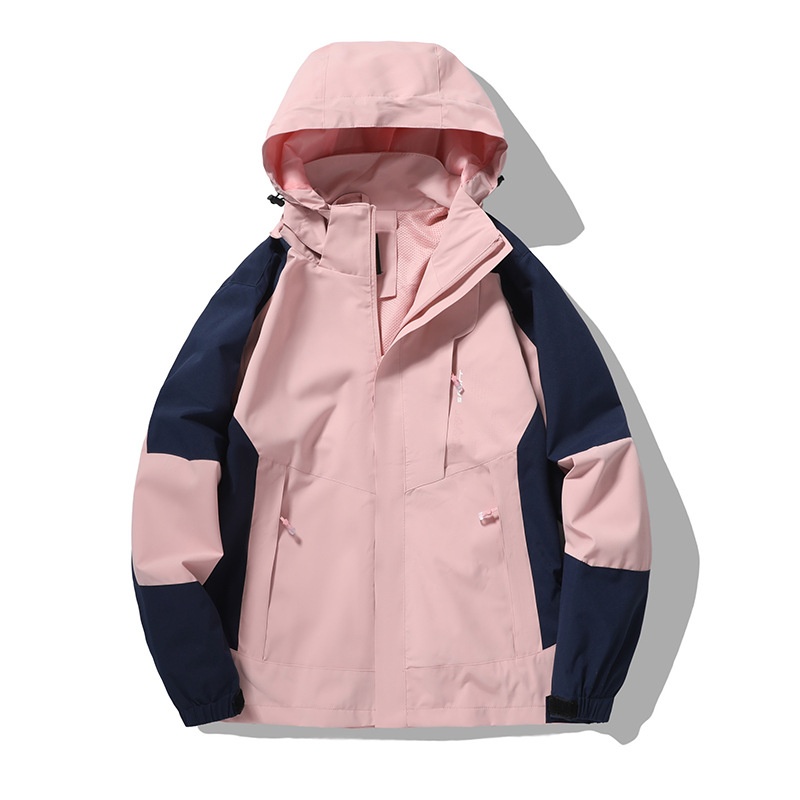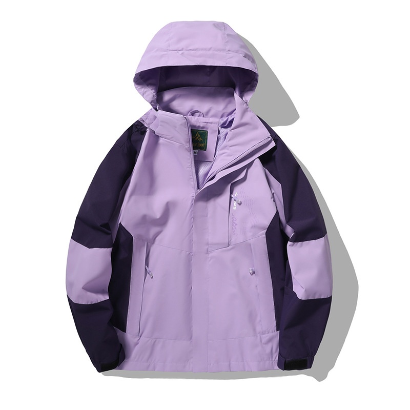 Veste de randonnée imperméable et coupe-vent pour femme, color block, avec capuche amovible. Modèle unique.