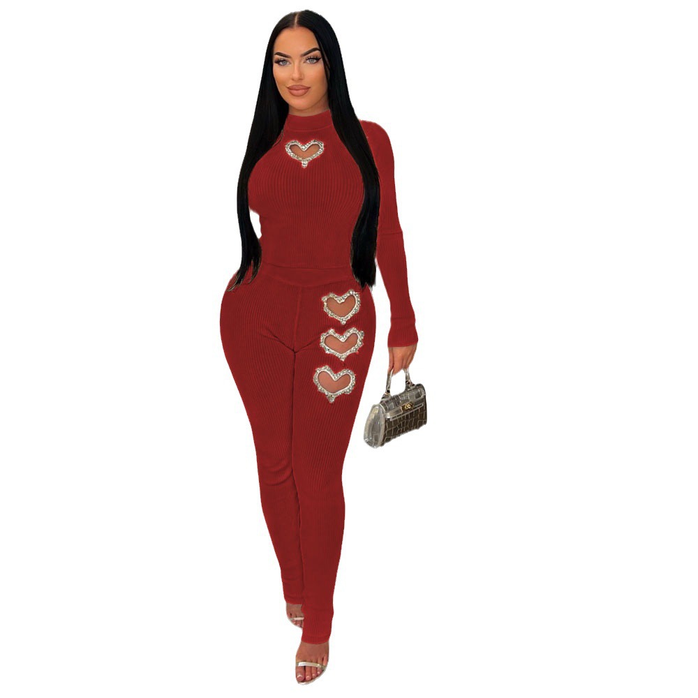 Vêtements pour femmes Y1280 vente chaude vêtements pour femmes automne et hiver nouveaux produits à manches longues en forme de coeur creux diamant chaud costume de couleur unie