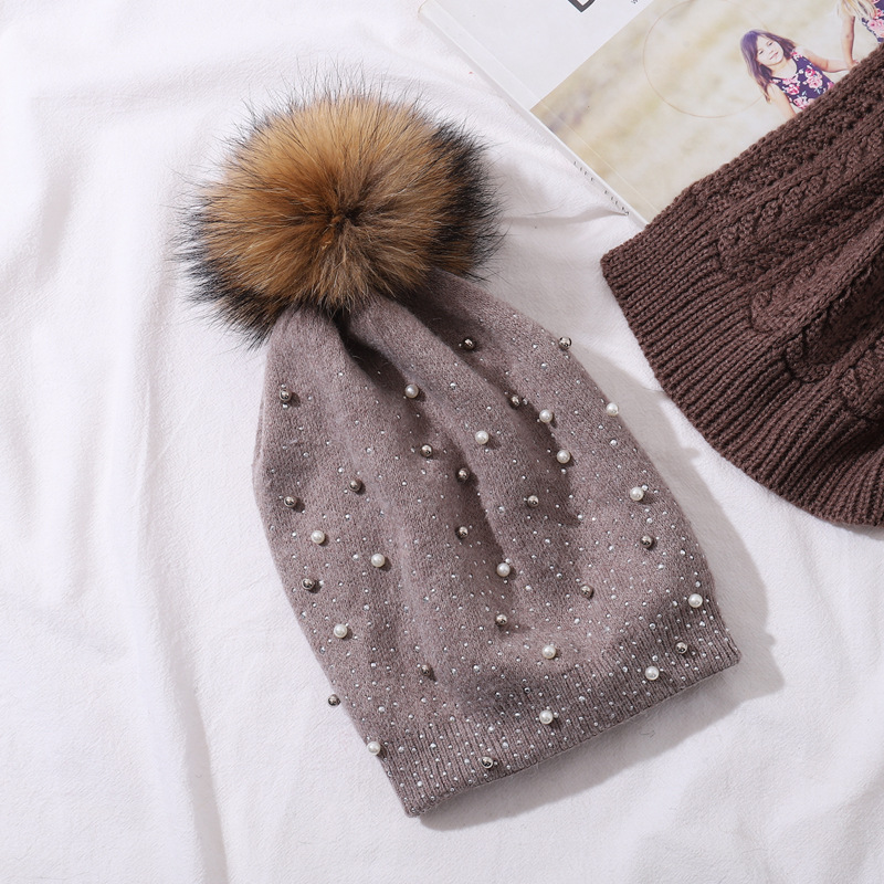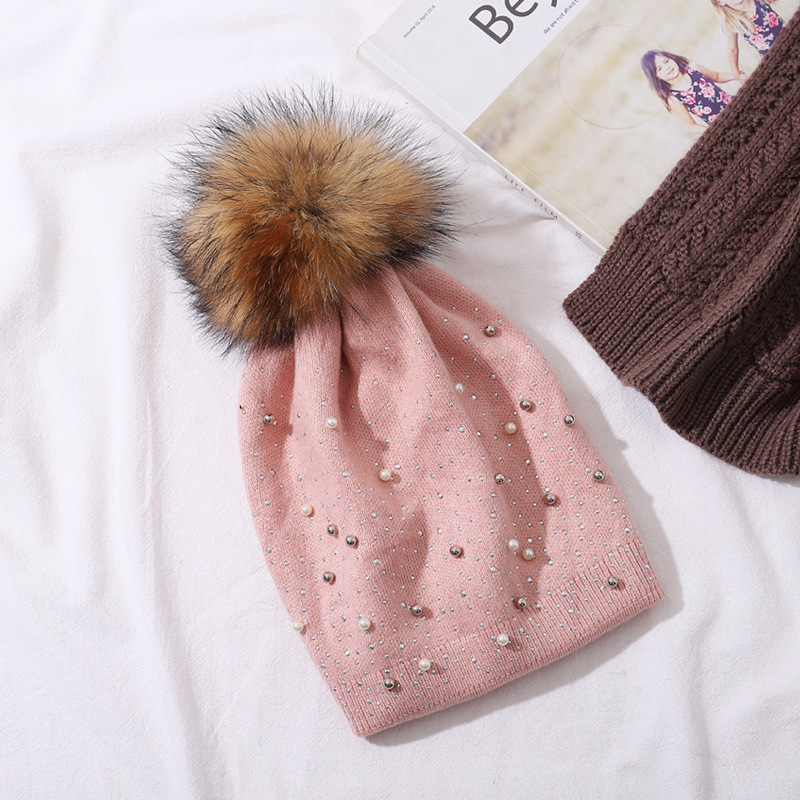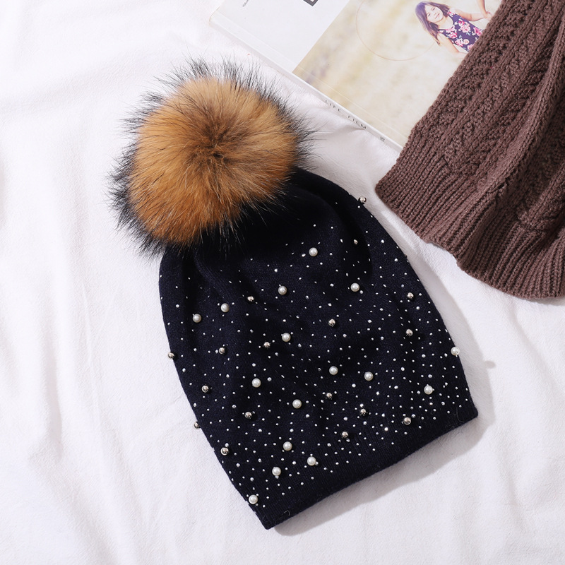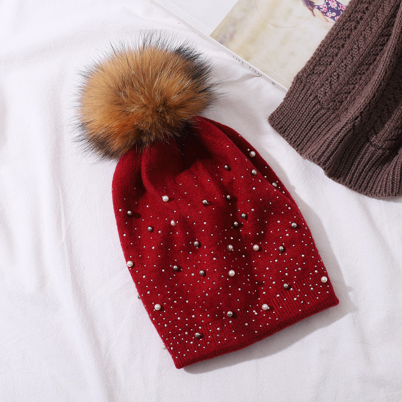 Perle de laine pour femmes pour la chaleur de l'hiver, chapeau tricoté en boule de fourrure de raton laveur, style pull à la mode pour femmes